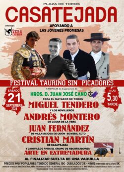 El próximo día 21 de septiembre Casatejada (Cáceres), nos ofrece un festejo taurino sin picadores en el que también se podrá disfrutar de un espectáculo de recortes en el que lidiarán dos novillos los integrantes del grupo de recortadores Arte en Extremadura.