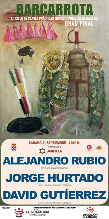 Se lidiarán 6 novillos de la ganadería de Jandilla para Alejandro Rubio (Escuela Taurina YIYO de Madrid), Jorge Hurtado (Escuela Taurina Diputación de Badajoz) y David Gutiérrez (Escuela Taurina de Badajoz).