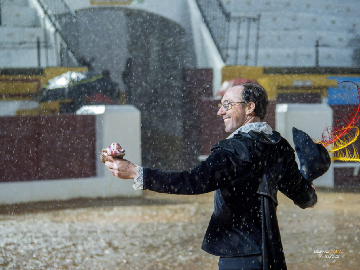 El segundo que salía por la puerta de toriles era para Sergio Domínguez «El Mella», novillo con algo menos de peso que el primero de la tarde, 446 kilos eran los que presentaban el de Talavante y que era recibido con un saludo capotero serio, asentado y con un buen manejo del percal por parte del Barcarroteño. Tercio de varas y de banderillas resueltos con rapidez y ligereza en previsión de lo que se nos venia encima. Buena faena de muleta, El Mella asentaba las manoletinas en el lodazal en el que se estaba convirtiendo la plaza y tiraba con la muleta de un novillo que repetía y que de haber sido otras las condiciones meteorológicas muy seguramente habría dado muchísimo más juego con la pañosa. Media estocada bien agarrada hace al novillo rodar como si la espada hubiese entrado hasta los gavilanes y una oreja trabajada y merecida oreja para El Mella.