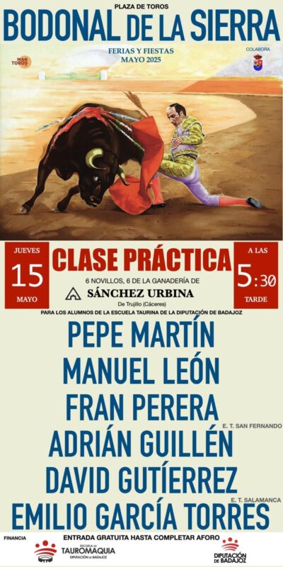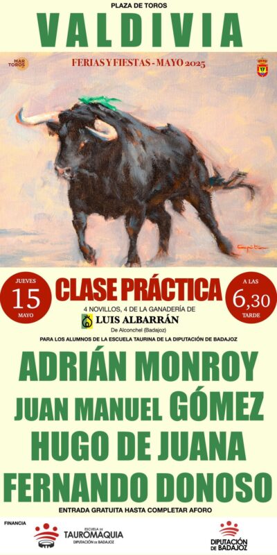La próxima cita de la Escuela Taurina de la Diputación de Badajoz será el día 15 de mayo y será por partida doble, las localidades de Bodonal de la Sierra y Valdivia acogerá ambas citas con los alumnos de la escuela taurina, las dos clases prácticas darán comienzo a las 18:30 horas y en las dos clases el acceso será gratuito hasta completar el aforo.