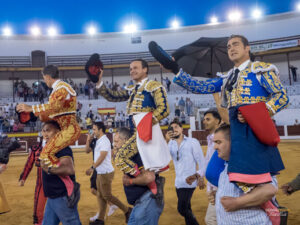 El Fandi de azul pavo y oro oreja y dos orejas y rabos simbólicos